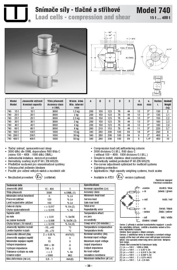 詳細特征: 標準量程:100-200-400t 精度等級:1000n. OIML 最小靜載:0% Ln 負載:120% Ln 安裝負載限制:150% Ln 總誤差<±0.05%Sn 重復性誤差 <±0.015%Sn 溫度零度漂移 <±0.01%Sn/5K 靈敏度溫差影響 < <±0.018%Sn/5K 蠕變誤差(30分鐘)<±0.048%Sn/5K 溫度補償: -10 to +40 °C 溫度范圍: -20 to +70 °C 標稱靈敏度(Sn): 2± 0.5% mV/V 額定輸入電壓: 10 V 最大輸入電壓: 15 V 輸入阻抗: 800 ± 300 Ohm 輸出阻抗: 700 ± 30 Ohm 空載輸出<±2%Sn 絕緣電阻 > 5000 MOhm 最大偏差(at Ln):1.4-2.6mm