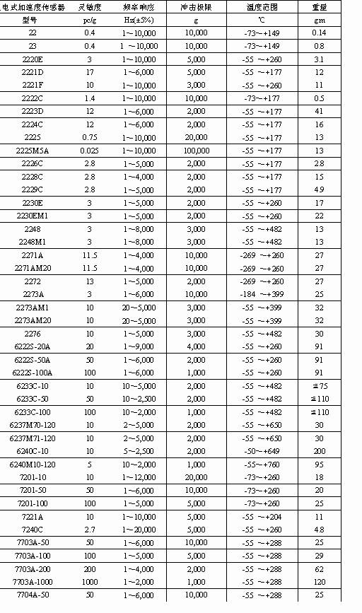 電式加速度傳感器 型號 22 23 2220E 2221D 2221F 2222C 2223D 2224C 2225 2225M5A 2226C 2228C 2229C 2230E 2230EM1 2248 2248M1 2271A 2271AM20 2272 2273A 2273AM1 2273AM20 2276 6222S-20A 6222S-50A 6222S-100A 6233C-10 6233C-50 6233C-100 6237M70-120 6237M71-120 6240C-10 6240M10-120 7201-10 7201-50 7201-100 7221A 7240C 7703A-50 7703A-100 7703A-200 7703A-1000 7704A-50 |